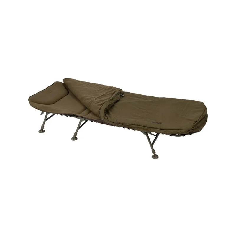 EOS Sleep System posiada zapinany na zamek śpiwór z izolacją termiczną, który zapewnia komfort termiczny od wiosny do jesieni. Warstwa wewnętrzna z miękkiego materiału polarowego gwarantuje przyjemne ciepło, natomiast zewnętrzna powierzchnia z poliestru chroni przed wilgocią. Całość tworzy kompletny system spania, idealny dla karpiarzy oczekujących praktycznego i gotowego rozwiązania.