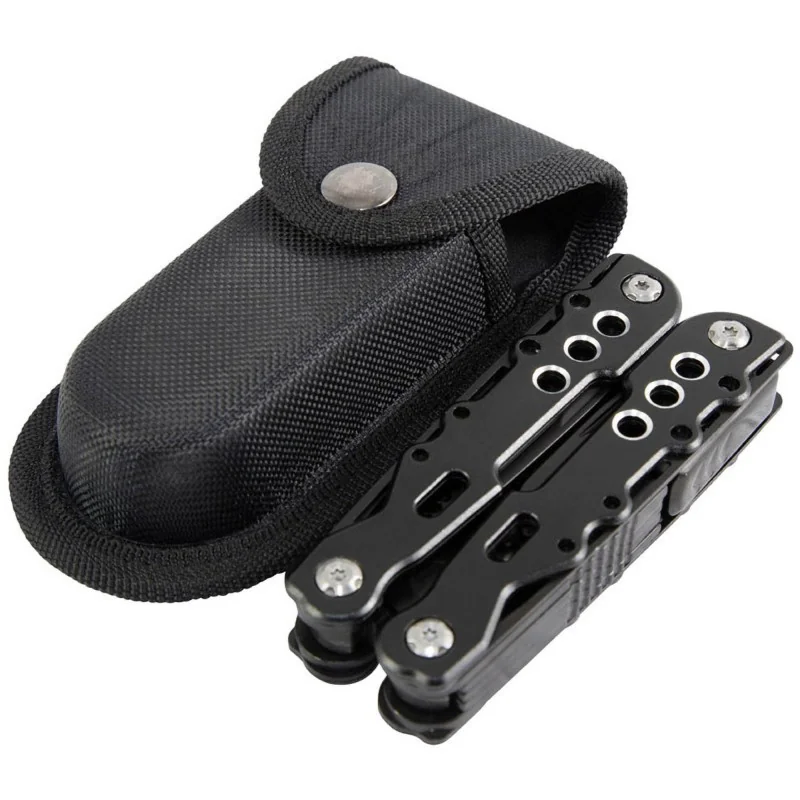 - Posiada 14 narzędzi: kombinerki, kombinerki z ostrym końcem, przecinak do drutu, narzędzie do ściągania izolacji, mały nóż, otwieracz do butelek, otwieracz do puszek, brzeszczot piły, pilnik do paznokci, duży wkrętak płaski, średni wkrętak płaski, mały wkrętak płaski i wkrętak krzyżakowy,