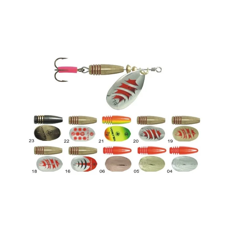 Błystki obrotowe Vortex, o szerokich owalnych listkach, stosowane często do dalekich rzutów. Posiadają charakter wielozadaniowy, szybko schodzą w głębsze wody łowiska. Uzbrojone w chemicznie ostrzoną, potrójną kotwicę VMC. Perfekcyjnie zaprojektowane strzemiączko, korpus o średniej wadze oraz skrzydełko pracujące pod kątem obrotu 60 stopni, wykonane z wysokiej jakości mosiądzu. Drut wykonany ze stali nierdzewnej.
