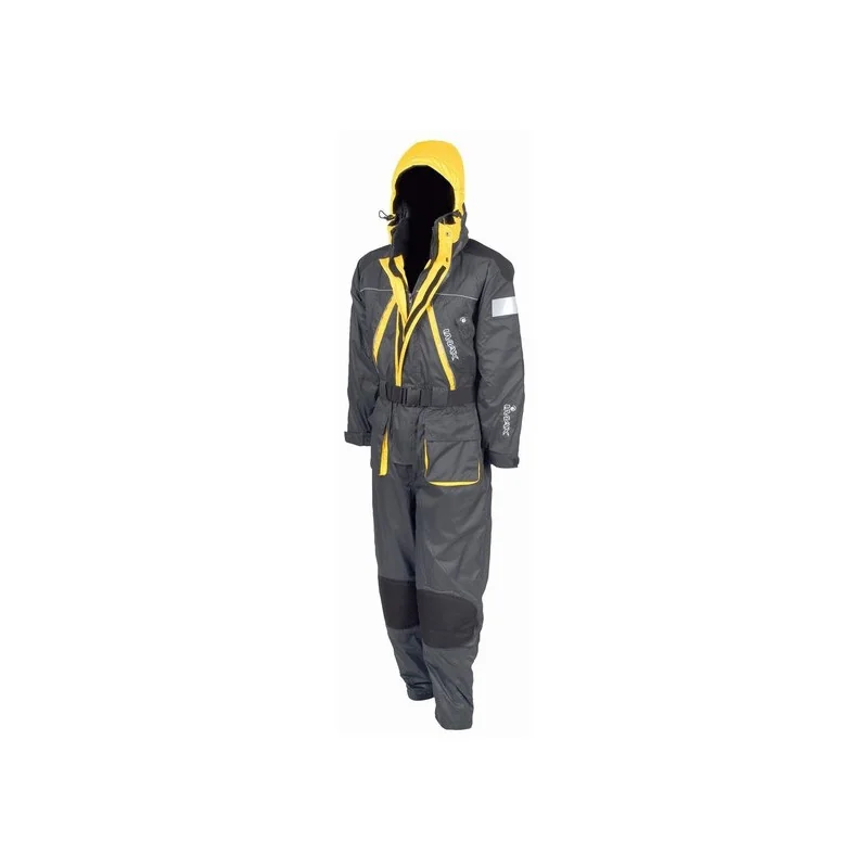 Niewiarygodnie lekki, miękka oddychająca powłoka zewnętrzna, oddychająca pianka pływająca o niskiej gęstości, ochrona przed wycieraniem, wzmocnione kolana, siedzenie, łokcie i ramiona, duże kieszenie do ogrzewania rąk zamykane na zamki błyskawiczne, silikonowe uchwyty na osłonach sztormowych kieszeni do ogrzewania rąk, mocno odblaskowe wszywki, ergonomiczny, regulowany kaptur nie pogarszający widoczności, gwizdek bezpieczeństwa, wysokiej wytrzymałości regulowane szelki wyposażone w polarową powłokę pleców i ramion.