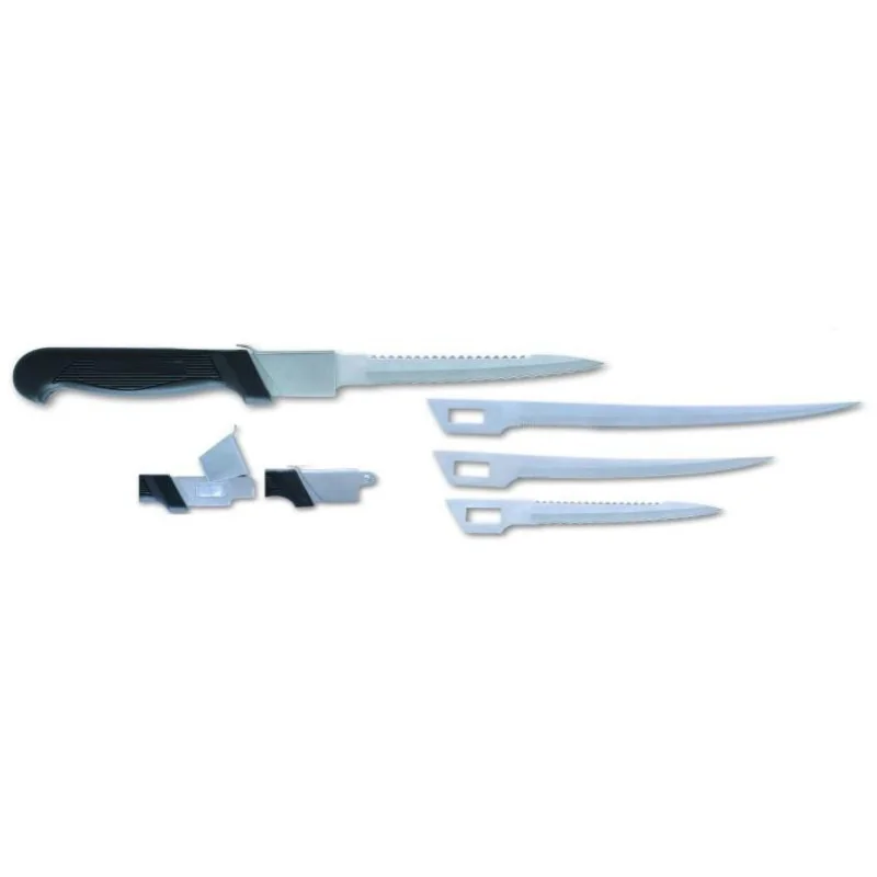 Nóż z wymiennymi ostrzami z wysokiej jakości stali zapewni uniwersalne użycie jednej rękojeści noża do wykonywania wielu czynności. Zatrzask na wymianę ostrza zapewnia łatwość dostosowania noża do potrzeb. W zestawie znajdują się: uniwersalne ostrze z piłką-dł.27cm.,ostrze do filetowania-dł.30cm oraz ostrze do filetowania z ząbkami do skrobania łuski-dł.36cm.