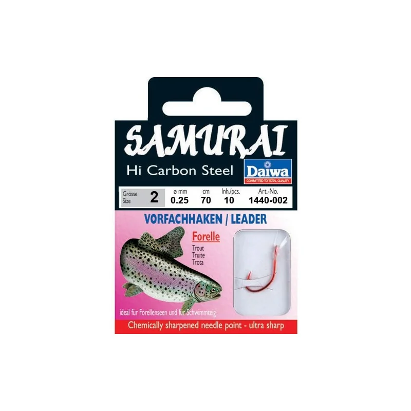 Haki z przyponami Daiwa najwyższej klasy. Każdy węzeł na haku i przy pętelce indywidualnie testowany do ich produkci użyto jedynie najlepszych żyłek DAIWA Made in Japan, do ktoacute,rych znakomite japońskie haki wiązali absolutni specjaliści. Super mocne i formą dokładnie dopasowane do danego gatunku ryby.