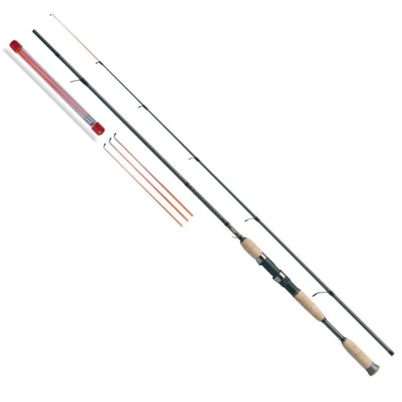 W komplecie 3 wymienne szczytówki – wskaźniki brań wykonane z pełnego włókna.Zwracamy uwagę na konieczność szczególnie delikatnego obchodzenia się ze szczytówką np. w sytuacjach kiedy odkładamy wędkę, przemieszczamy się z uzbrojoną wędką na łowisku bez jej składania, oraz w każdym przypadku kiedy mamy zaczepioną przynętę za uszko nad uchwytem i wybieramy luz żyłki. Na czas transportu zalecamy zdemontowanie wymiennej szczytówki, gdyż naciągnięta w przeciwną stronę żyłka może łatwo doprowadzić do złamania tego czułego elementu. Należy także uważać, aby podczas rzutów żyłka bądź plecionka nie owinęła się wokółprzelotki szczytowej.