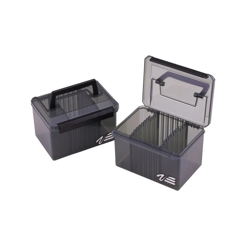 POJEMNIK BEZ AKCESORIÓW WIDOCZNYCH NA ZDJĘCIU! Niewielka skrzyneczka z górnym uchwytem. Dwie regulowane, użebrowane przegrody pozwalają na pionowe przechowywanie średnich przynęt. Po zdjęciu przegród otrzymujemy uniwersalne pudełko mogące służyć np. do przechowywania przynęt gumowych w woreczkach strunowych. Zamknięcie typu „One-Hand". Pudełko jest kompatybilne z ze skrzyniami: „8050", „3080" i „3078".