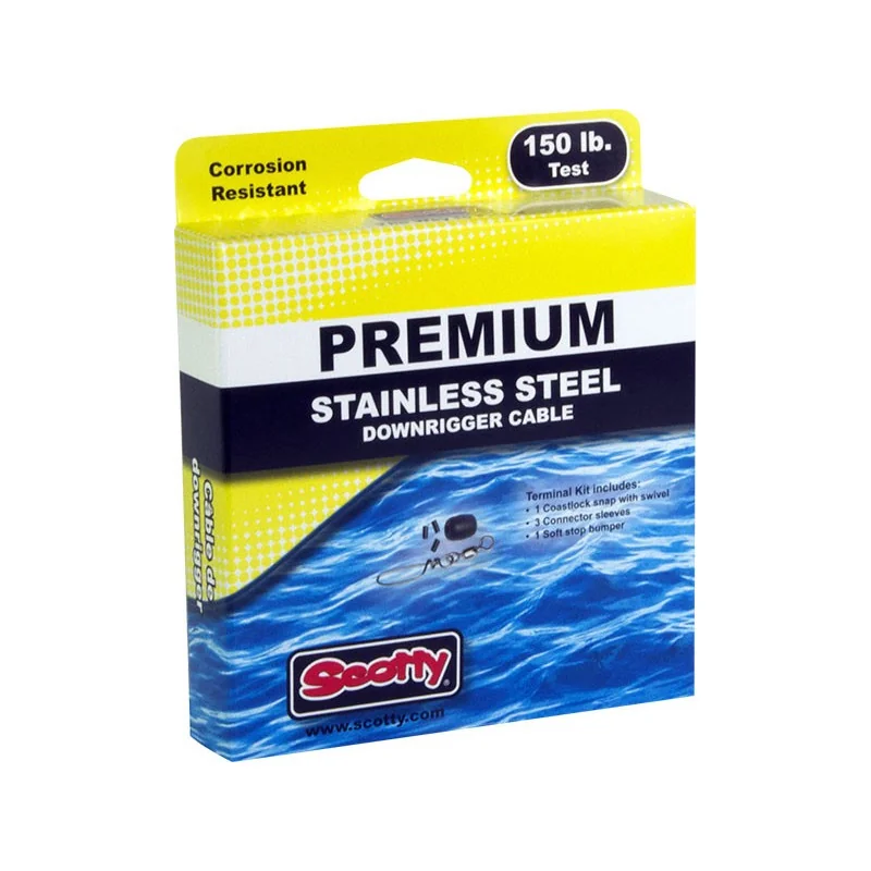 Stalowa, nierdzewne linki plecione (1x6) do windy Scotty. 1000K: długość 200 ft / 61 m, wytrzymałość 150 lb / 67,5 kg). 1101K: długość 300 ft / 91 m, wytrzymałość 150 lb / 67,5 kg). W kartoniku zestaw zakończeniowy z agrafką.