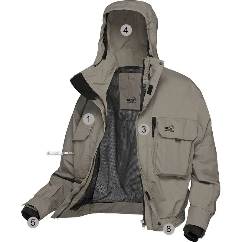 Kurtka Raptor 4™ została stworzona do użytkowania w miejscach, gdzie najważniejszym parametrem stawianym odzieży jest wysoka wodoszczelność. Geoff Anderson poleca tę kurtkę wędkarzom brodzącym w morzu. Duńska firma postawiła tutaj na tkaninę o nazwie T.S.F.™ Classic Wet Type™ . To specjalna, 3-wartwowa membrana wykonana z poliuretanu, posiadająca miliony mikroskopijnych porów, które pozwalają na transmisję pary wodnej przy jednoczesnym blokowaniu dostępu wody. Membranę połączono z materiałem Taslan o wyjątkowo gęstym splocie. To rodzaj nylonu wyjątkowo odporny na zużycie, będący obecnie jedną z najlepszych tkanin na odzież outdoorową. Wodoszczelność kurtki została podniesiona do 3500 mm słupa wody (silny deszcz to ciśnienie 1000 mm), a oddychalność do poziomu 4000 g/m2. Dodatkowo wszystkie szwy zostały wzmocnione, a ściągacze rękawów wykończono Lycrą i specjalnymi, szczelnymi mankietami zamykanymi na rzepy. Dzięki temu woda nie dostaje się podczas brodzenia czy deszczu i możemy podbierać rybę ręką nawet pod powierzchnią lustra wody. Raptor 4™ posiada cztery kieszenie: dwie bardzo pojemne kieszenie na przedzie do przechowywania pudeł z przynętami, kieszeń wewnętrzną na telefon lub kluczyki oraz dużą kieszeń na plecach (35 x 40 cm) z drenem i zamknięciem na zamek YKK®. Znajdziemy tu także zaczep na latarkę lub peana. Kaptur jest tak ukształtowany żeby podążać za ruchami głowy i nie przeszkadza przy wędkowaniu w czapce i okularach. Zdecydowanie polecamy tę kurtkę zwłaszcza spinningistom i muszkarzom. Kolory: piaskowy, zielony, szary. Rozmiary: od S do XXXL. Waga: 850 g (XXL).