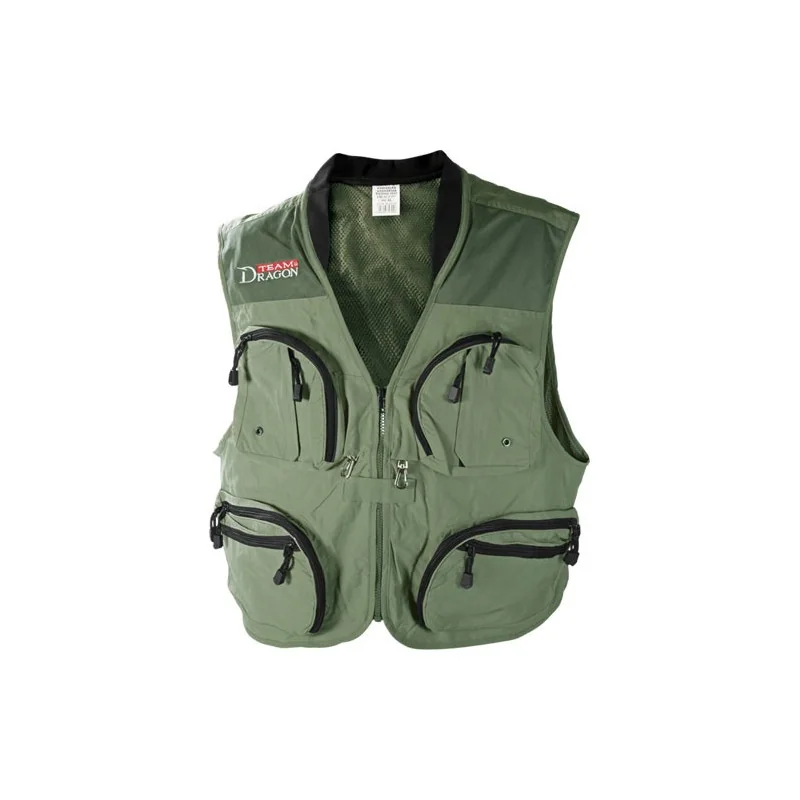 W kamizelkach Dragona zastosowano specjalny rodzaj tkaniny o nazwie Nylon Taslan Fabric™, która poza właściwościami odprowadzania wilgoci ma kilka nieocenionych zalet. Jest bardzo lekka, łatwa w czyszczeniu, a co najważniejsze – bardzo odporna na przetarcia. W dolnych, najczęściej używanych kieszeniach na pudełka zastosowaliśmy podwójne zamki dwukierunkowe. Funkcjonalnym dodatkiem są karabińczyki na sprężynowych linkach, które służą do zaczepienia peana, obcinaczek lub miarki.