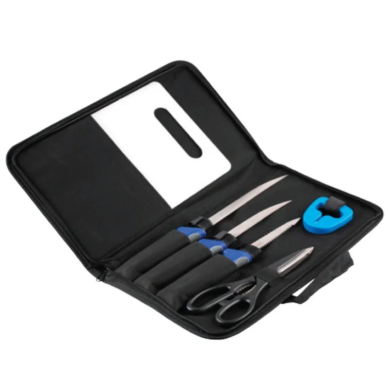 Zestaw wysokiej klasy noży z japońskiej stali nierdzewnej 440 w skład którego wchodzą - dwa noże do filetowania (15 i 20 cm) o miękkim i smukłym ostrzu, idealnie dopasowującym się do powierzchni wzdłuż której przechodzi cięcie, 13 centymetrowy nóż do skrobania oraz do usuwania ości o ząbkowanym ostrzu i ostrzałka. Wszystkie noże w zestawie posiadają wygodne, antypoślizgowe uchwyty. W komplecie poręczne, sztywne etui.