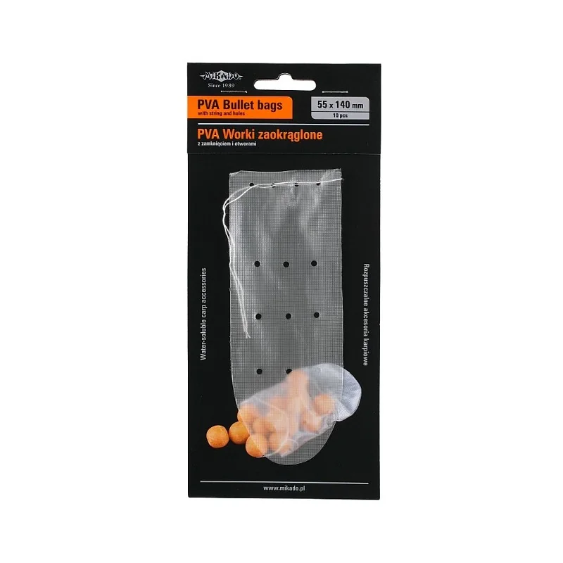 PVA worki zaokrąglone z zamknięciem i otworami. Przeznaczone do umieszczania przynęt zanętowych w miejscu połowu, występują w różnych wielkościach i kształtach oraz wersje z otworami i zamknięciem. Dostępne kształty: prostokątny, zaokrąglony oraz stożkowy.
