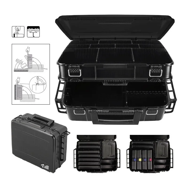 Ta dwukomorowa skrzynka została stworzona byś wszystkie przynęty i niezbędne akcesoria miał zawsze pod ręką. Górna, nieco płytsza komora jest zabezpieczona pokrywą z mocnego poliwęglanu. Dzięki wielu wymiennym przegródkom daje niemal nieograniczoną możliwość organizacji. Pod pokrywą znajdują się otwory wentylacyjne przyspieszające suszenie przynęt. Dolna, głęboka na 12 cm komora pozwala na przechowywanie większego sprzętu. Znajdziemy tutaj także użebrowane i wyjmowane przegrody, służące jako wieszaki do najczęściej używanych przynęt. Po zdemontowaniu przegród możemy wypełnić komorę mniejszymi, kompatybilnymi pudełkami w konfiguracji: 4 pudełka „LL” + 2 pudełka „820” + 1 pudełko „4060” lub 7 pudełek „820” + 1 pudełko „4060”. Większą komorę możemy także wykorzystać do przechowywania aparatu, ekranu echosondy, kołowrotków i wielu drobniejszych akcesoriów. Na bokach skrzynki znajdziemy uchwyty mogące służyć jako wieszaki do przynęt i pozwalające przymocować ją do relingu łodzi podczas szybkiego pływania. Opatentowany, pięciopunktowy system zamykania komór plus rączka, która po podniesieniu blokuje klapę dają 100% gwarancję, że nawet mocno obciążone pudło nie otworzy nam się podczas przenoszenia. Mocny, duży uchwyt i gumowe, antypoślizgowe nóżki dopełniają całości. Model „3080” można stawiać w dwóch pozycjach. Wymiary (dł./szer./wys.): 48 x 35,6 x 18,6 cm.