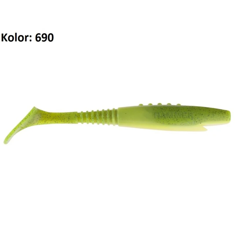 HAMMER to przynęta stworzona przede wszystkim do trollingu, a pomysł na nią przyszedł z Irlandii, od naszego kolegi Jacka Gornego. Hammer uzbrojony w systemik z dozbrojkami okazał się na testach wręcz zabójczo skuteczny i przywabiał szczupaki nawet w okresach bardzo słabych brań. Świetne recenzje zebrał też wiosną w Szwecji, gdzie, mimo swojej dużej masy, zaliczał piękne ryby na płytkich łowiskach szkierowych. Charakterystyczna dla Hammera jest bardzo szeroka praca ogona w poziomie jak i skręty samej płetwy wokół osi. Masa kolebiącego się na boki ogona wywołuje reakcję środkowej części przynęty – dzięki kilku nacięciom w tylniej części korpusu efektem jest migotanie bokami.