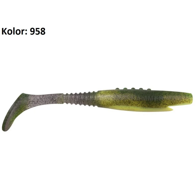 HAMMER to przynęta stworzona przede wszystkim do trollingu, a pomysł na nią przyszedł z Irlandii, od naszego kolegi Jacka Gornego. Hammer uzbrojony w systemik z dozbrojkami okazał się na testach wręcz zabójczo skuteczny i przywabiał szczupaki nawet w okresach bardzo słabych brań. Świetne recenzje zebrał też wiosną w Szwecji, gdzie, mimo swojej dużej masy, zaliczał piękne ryby na płytkich łowiskach szkierowych. Charakterystyczna dla Hammera jest bardzo szeroka praca ogona w poziomie jak i skręty samej płetwy wokół osi. Masa kolebiącego się na boki ogona wywołuje reakcję środkowej części przynęty – dzięki kilku nacięciom w tylniej części korpusu efektem jest migotanie bokami.