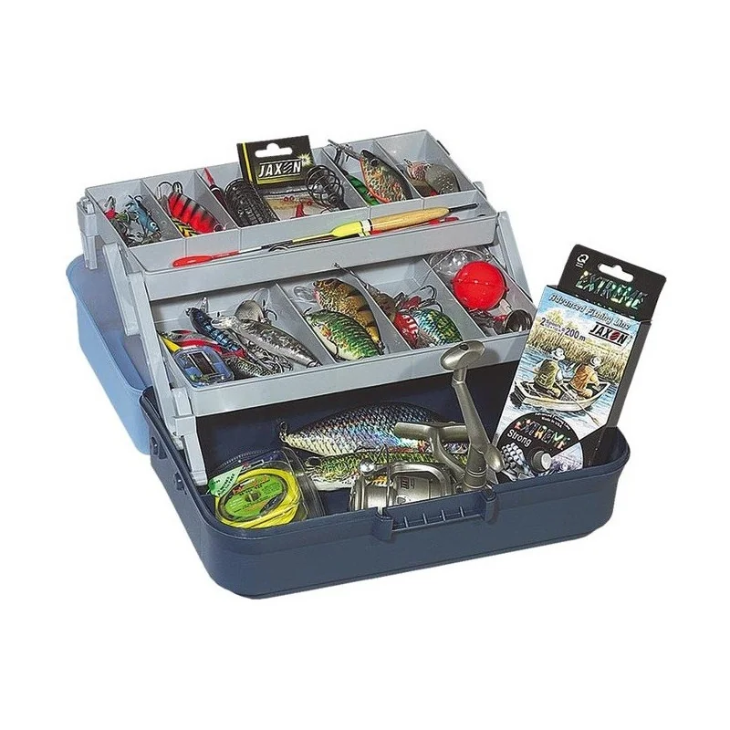Średniej wielkości, popularna skrzynka wędkarska z dwoma szufladami.