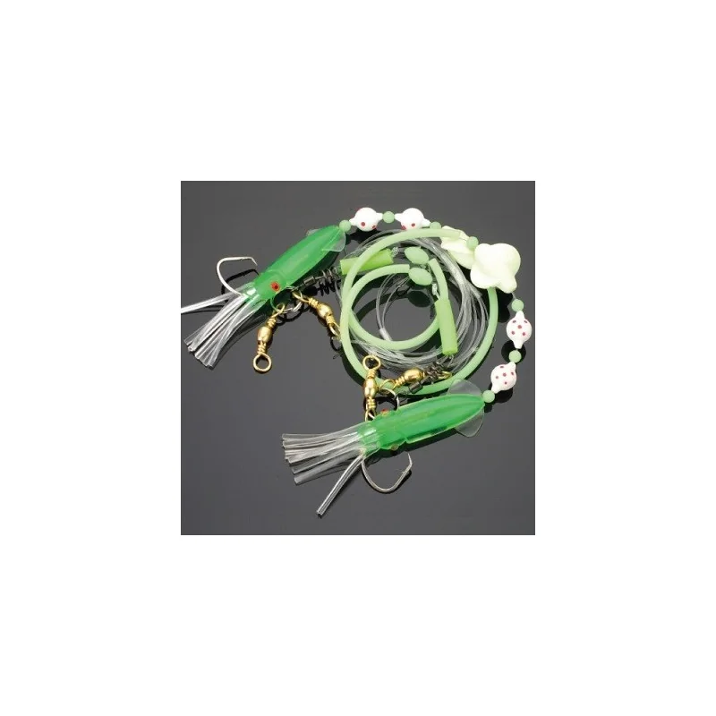 Holger zaprojektował ten zestaw jako uniwersał na płytkie wody- świetnie sprawdzi się przy połowie morszczuków, dorszy, brosm i molw. Obracające się fluorescencyjne koraliki tworzą falę hydroakustyczną, która po odebraniu przez linię boczną ryb szybko ściąga je w pobliże przynęty. Zestaw polecany na głębokości od 5 do 50m.