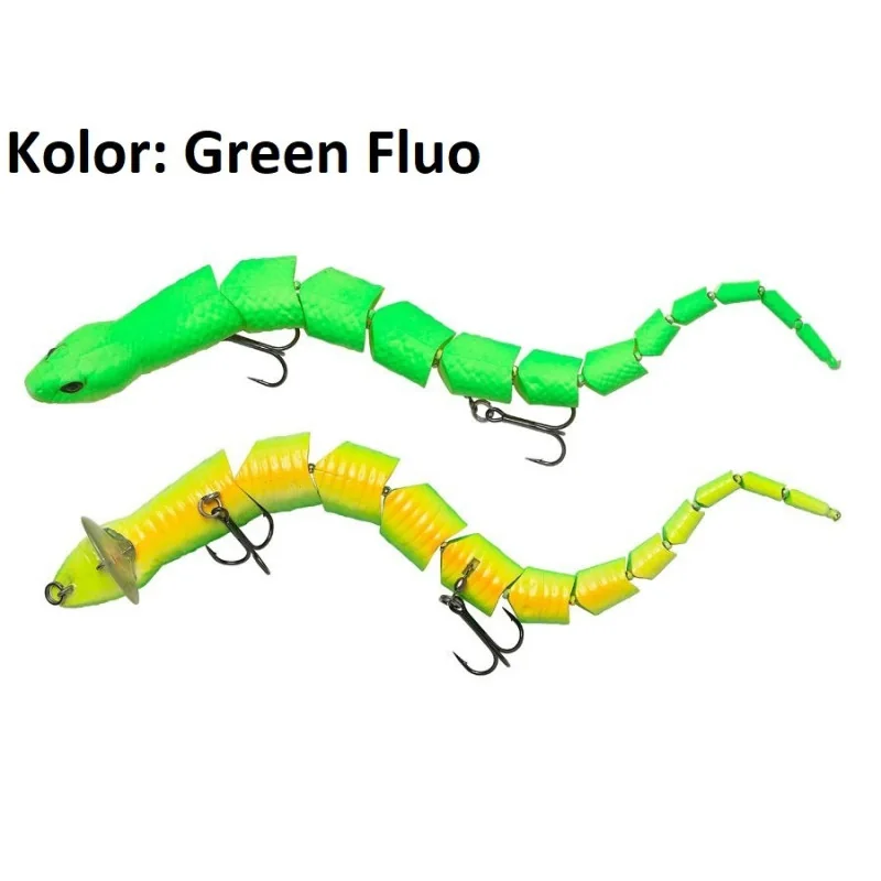 Oparty na skanowaniu prawdziwego węża. Doskonała imitacja młodego węża z najbardziej realistyczną akcją powierzchniową, jaka jest możliwa do osiągnięcia. Przynęta porusza się z szeroką wężowatą pracą po powierzchni wody lub zaraz pod jej lustrem – w zależności do którego oczka przypniemy przypon.