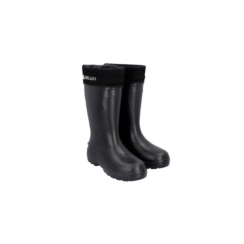 Kalosze firmy MIKADO wykonane z ultralekkiego materiału EVA (czyli trwałej pianki sprawiającej że buty są lekkie, ważą zaledwie 600 gram/ para). Materiał z którego są wykonane sprawia, że są łatwe w utrzymaniu czystości, ciepłe i nie przepuszczają wody. W butach znajdują się wyjmowane ocieplacze, dzięki którym można je nosić nawet w niskich temperaturach (do -30 stopni C). Produkt najwyższej jakości.