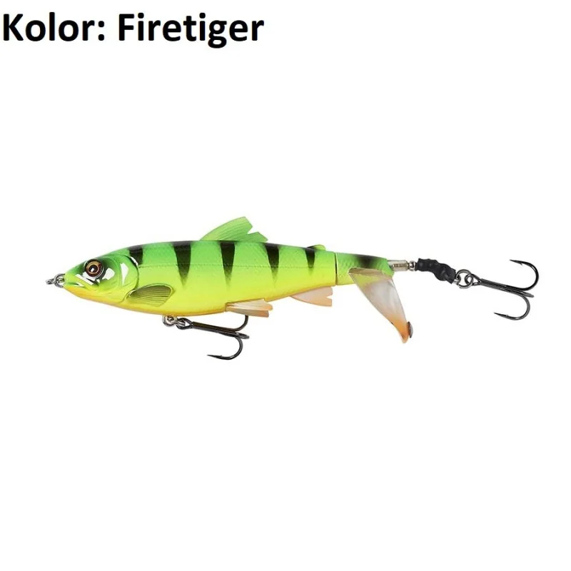 Oparty na skanowaniu 3D prawdziwych młodych pstrągów, realistyczny kształt i wysoki poziom detali. Obracający się ogon rozbija wodę generując głośne chlupotanie, pozostawia bąble i wyraźny ślad za przynętą. Mały nit w ogonie wzmacnia dźwięk i rozprysk wody nęcąc potężne drapieżniki do ataku!