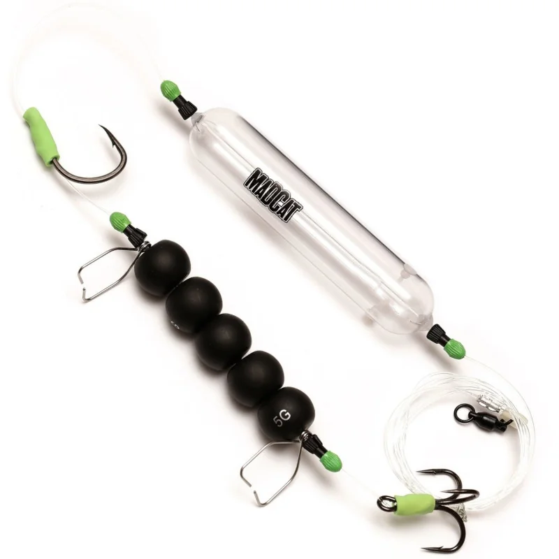 Zestaw z „cichym” podwodnym spławikiem MADCAT® Ajusta Subfloat do łowienia gruntowego w rzekach o szybkim uciągu za pomocą martwej rybki. Zbudowane na lince MADCAT® Ultra Soft Mono Leader 1.0mm. Długość całkowita : 180 cm. Dostępne w rozmiarach: 20, 40 i 60 gram (do wielkości przynęt: 25, 28,5 i 32 cm). Moc zestawu to 100 lb.