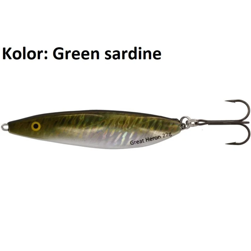 "Great Heron jest przynęta zaprojektowaną zgodnie z fińską tradycją tworzenia przynęt. Został on stworzony i przetestowany we współpracy z doświadczonymi wędkarzami z Finlandii i Szwecji. Od samego początku okazał się bardzo łowną przynętą - nie tylko troci i łososi, ale również gatunków takich jak bolenie, okonie czy szczupaki. Great Heron może być prowadzony szybko lub wolno. Niezależnie od szybkości ma bardzo żywą pracę, która kusi do brania. Nic dziwnego, ze przynęta ta stałą się jedną z najbardziej popularnych przynęt w Skandynawii!