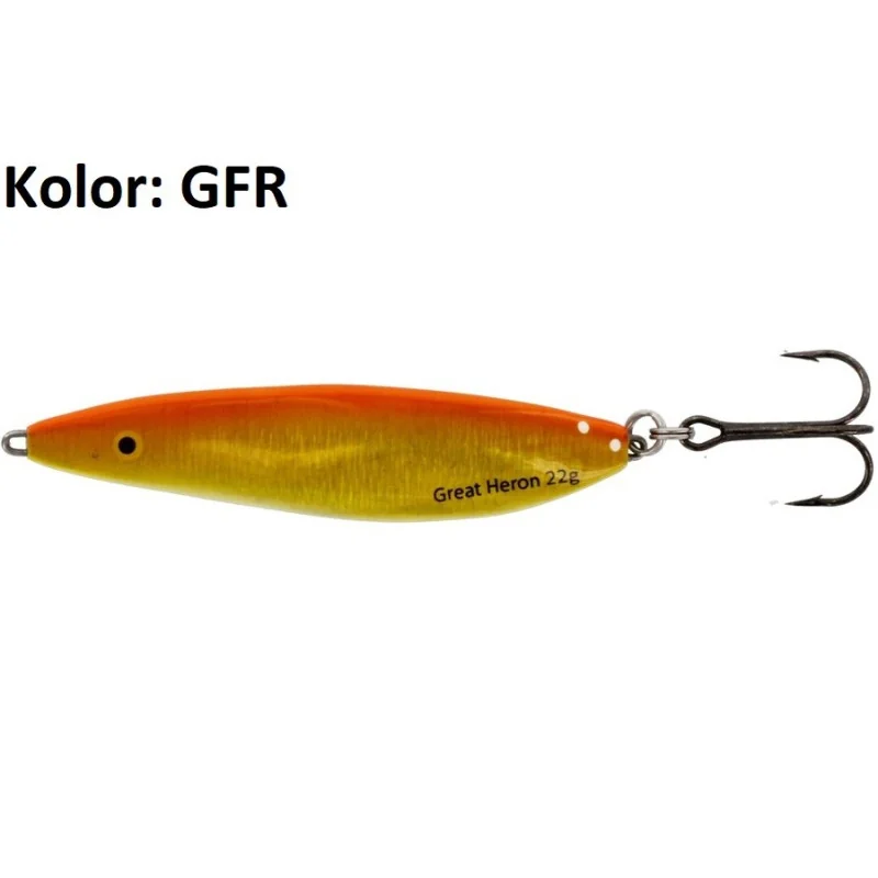 "Great Heron jest przynęta zaprojektowaną zgodnie z fińską tradycją tworzenia przynęt. Został on stworzony i przetestowany we współpracy z doświadczonymi wędkarzami z Finlandii i Szwecji. Od samego początku okazał się bardzo łowną przynętą - nie tylko troci i łososi, ale również gatunków takich jak bolenie, okonie czy szczupaki. Great Heron może być prowadzony szybko lub wolno. Niezależnie od szybkości ma bardzo żywą pracę, która kusi do brania. Nic dziwnego, ze przynęta ta stałą się jedną z najbardziej popularnych przynęt w Skandynawii!