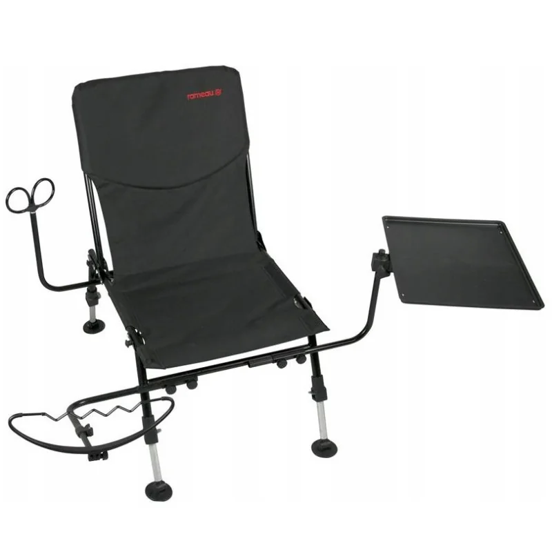Krzesło wędkarskie Rameau Feeder to wygodny fotel z osprzętem przeznaczonym do połowu metodą spławikową oraz na różne odmiany feedera. Krzesło wyposażone jest w teleskopowe, regulowane nogi z ruchomymi stopami, które dopasują się do każdego rodzaju terenu.