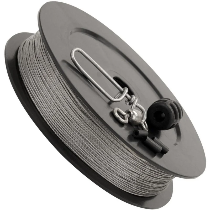 Wzmocniona plecionka stalowa całkowicie zabezpieczona przed korozją. Na szpuli 300 stóp (91 metrów) linki o wytrzymałości 180 funtów (81 kg). W komplecie zestaw zakończeniowy z agrafką.
