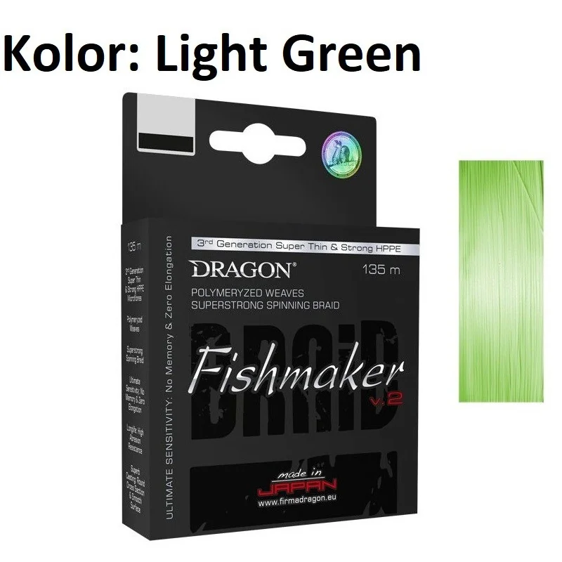 Bardzo gęsty splot uniemożliwia wnikanie cząstek wody, przez co linka nie zmienia swych właściwości w czasie łowienia, umożliwiając długie i precyzyjne rzuty. Dragon Fishmaker to plecionka idealnie okrągła w przekroju, bardzo wytrzymała zarówno liniowo, jak i na węzłach, pozbawiona pamięci kształtu i całkowicie nierozciągliwa. Dzięki dodatkowym zabezpieczeniom powierzchni w procesie polimeryzacji włókien (dodatek Amilanu) plecionka jest bardzo odporna na uszkodzenia mechaniczne i ścieranie. Nawet po długim okresie użytkowania nie zmienia swoich właściwości fizykochemicznych, a zewnętrzna powłoka nie ulega degradacji. Do znanej już rodziny produktów w nowej generacji dołącza plecionka w kolorze jasnozielonym fluo.
