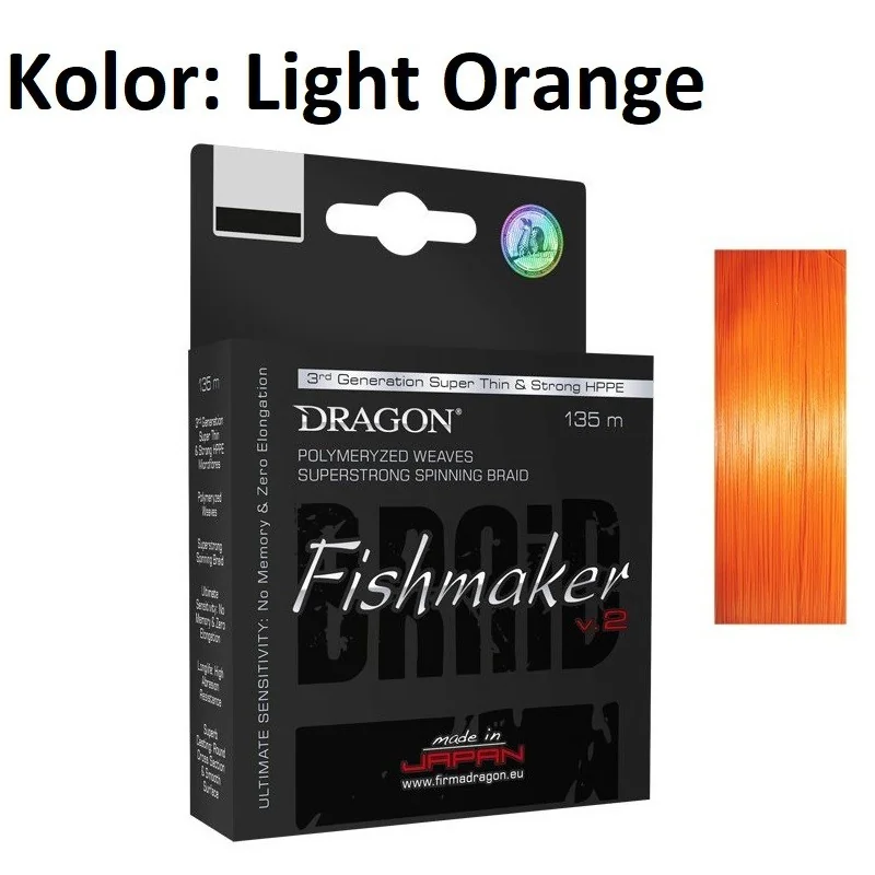 Bardzo gęsty splot uniemożliwia wnikanie cząstek wody, przez co linka nie zmienia swych właściwości w czasie łowienia, umożliwiając długie i precyzyjne rzuty. Dragon Fishmaker to plecionka idealnie okrągła w przekroju, bardzo wytrzymała zarówno liniowo, jak i na węzłach, pozbawiona pamięci kształtu i całkowicie nierozciągliwa. Dzięki dodatkowym zabezpieczeniom powierzchni w procesie polimeryzacji włókien (dodatek Amilanu) plecionka jest bardzo odporna na uszkodzenia mechaniczne i ścieranie. Nawet po długim okresie użytkowania nie zmienia swoich właściwości fizykochemicznych, a zewnętrzna powłoka nie ulega degradacji. Do znanej już rodziny produktów w nowej generacji dołącza plecionka w kolorze jasnozielonym fluo.