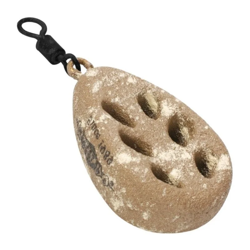 OMK 33 Ciężarek stosowany w celu szybkiego wytypowania obszaru, w którym należy umieścić zestaw końcowy. Dzięki specjalnym wypustkom może być oklejony (zanętą lub pastą), co dodatkowo wabi ryby w obszar przynęty. Kształt ciężarka zapewnia dobrą aerodynamikę, dzięki temu ostateczna forma po oblepieniu nie wpływa na odległość rzutu. Wersja z centrycznym mocowaniem.