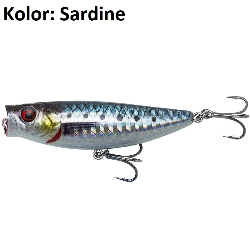 Opracowany na podstawie skanowania 3D młodych sardynek. To nie jest popper, nie jest to także walker, to oba typy przynęty w jednym. Łączy ona w sobie zalety oby typów przynęt. Doskonała praca powierzchniowa typu walk the dog, oraz silne rozpryski w czasie podciągnięć z opuszczoną szczytówką. Unosząc nieco szczytówkę Pop Walker zacznie pomykać po powierzchni z wyraźnym chlupotaniem. Poziome wyważenie w czasie zatrzymań doskonale imituje umierającą rybkę! Kompaktowa konstrukcja ułatwiające dalekie rzuty! Doskonała akcja powierzchniowa zarówno w wodzie słodkiej, jak i słonej!