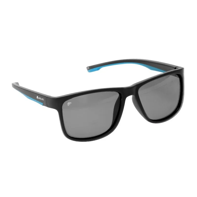 Okulary polaryzacyjne Mikado AMO-0484B w czarno-niebieskimi oprawkami oraz soczewkami w kolorze brązowym i szarym.