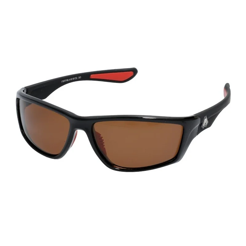 Okulary polaryzacyjne Mikado AMO-7774 z brązowymi soczewkami i czarnymi oprawkami, wykończonymi w połysku oraz w macie, z czerwonymi detalami.