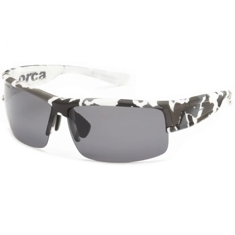 Okulary polaryzacyjne Solano FL 20021F1 XXL z ciemnoszarymi soczewkami i oprawkami we wzorze kamuflażu z kontrastującym, białym kolorem. Oprawki, soczewki oraz mostek na nos w tych okularach są większe, przez co są one jeszcze wygodniejsze.