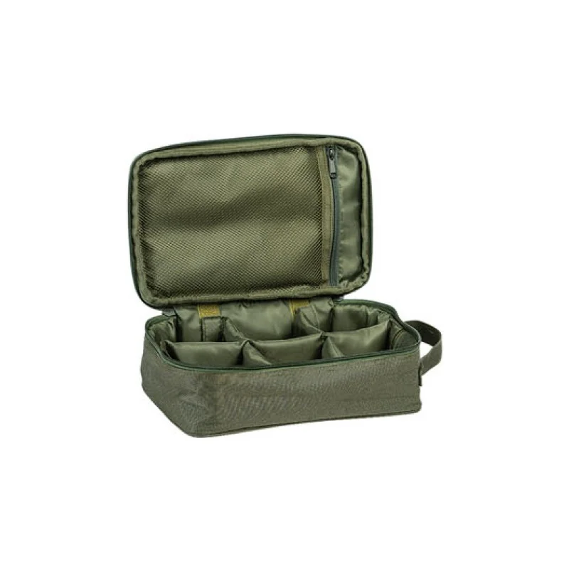 Torba z sześcioma przegródkami do przechowywania akcesoriów karpiowych.