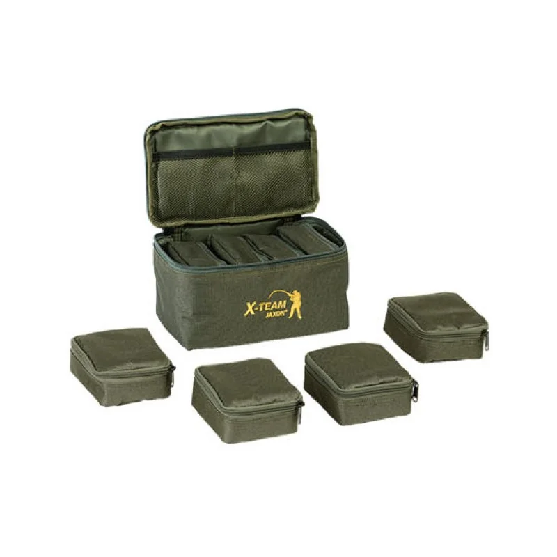 Komplet pięciu toreb Jaxon UJ-XCA08 do przechowywania akcesoriów karpiowych.