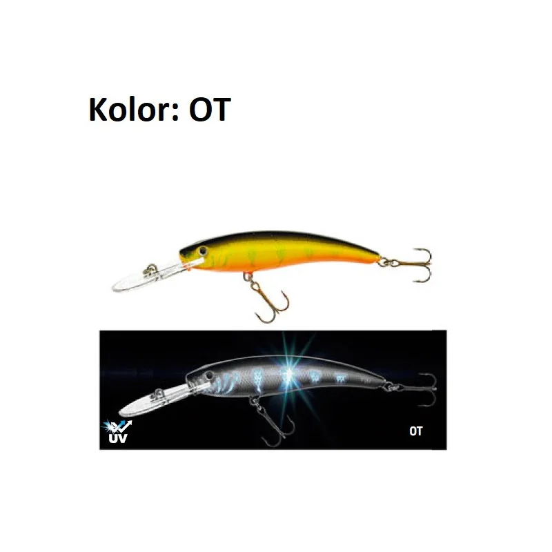 Wydłużone, smukłe woblery Jaxon Holo Select Diver UV z wydłużonym sterem, pokryte specjalną farbą UV.