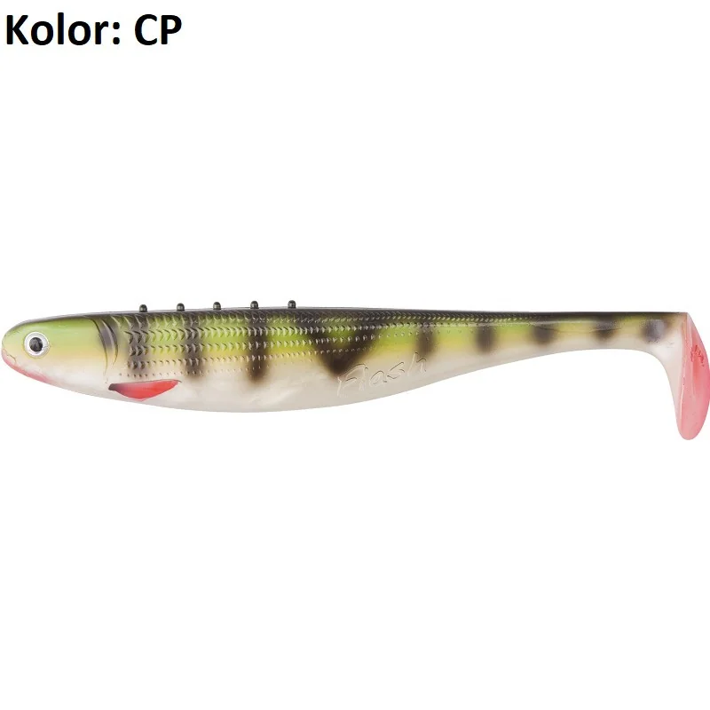 Flash jest dopracowany w najmniejszym detalu, od kształtu, proporcji i miękkości gumy zaczynając a na pięknym, ręcznym malowaniu kolorów kończąc. Ma solidny, ale dość niski i wydłużony korpus, przecieniony przegub ogona i duże kopyto na jego końcu. Pracuje spokojnie i pewnie, zarówno samym ogonkiem jak i bokami, lusterkując w sposób wabiący każdego szczupaka na swojej drodze. Perfekcyjnie imituje lekko ranioną czy chorą rybę, a to zawsze zwraca uwagę drapieżników, wybierających instynktownie najłatwiejszą ofiarę. Możesz go uzbroić w ciężarek z korkociągiem i dwie dozbrojki, gotowy systemik lub główkę jigową z dodaną pojedynczą dozbrojką. Lekko i ciężko, do łowienia na płyciznach i na głębokich stokach. Flash zawsze będzie bezkonkurencyjny!