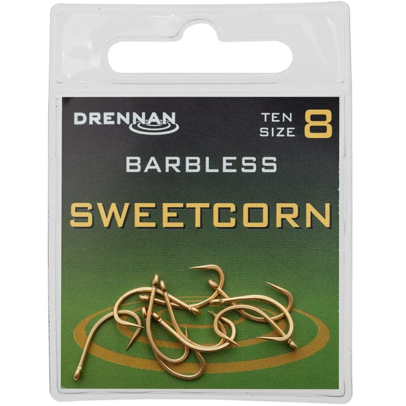 Bezzadziorowe haczyki Drennan Sweetcorn Barbless do łowienia przy użyciu kukurydzy. Chemicznie ostrzone w kolorze matowego złota.