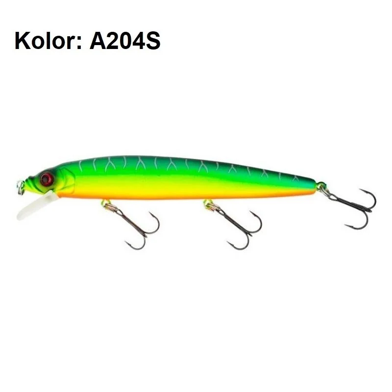 Alpha Minnow imitujące ukleję lub inną małą rybkę. Bardzo skuteczna na opaskowe sandacze oraz bolenie, okonie i pstrągi. Jak wszystkie woblery Strike Pro, przynęta ta charakteryzuje się najwyższą jakością wykonania korpusu oraz uzbrojenia. Nierdzewne stalowe kółka łącznikowe i kotwice VMC oraz różne kolory Alpha Minnow sprawiają, że przynęta jest bardzo skuteczna na różnych łowiskach. Krótki ster i wydłużony korpus pozwalają na szybkie prowadzenie woblera. Z łatwością można nimi obławiać bystrza oraz przelewy.