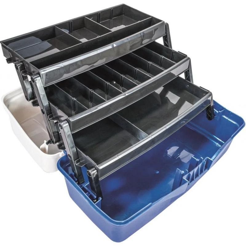 Skrzynka wędkarska Lorpio z 3 półkami z przegródkami na akcesoria. Wykonana z plastycznego materiału odpornego na pęknięcia. Mocna, składana rączka. Skrzynka ma wymiary 40 x 20 x 20 cm.