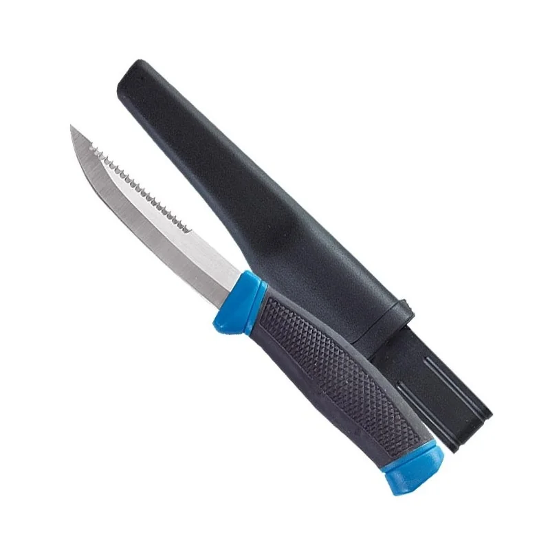 Nóż Jaxon długość 22cm. Za niewielkie pieniądze otrzymuje nóż przydatny w każdej wyprawie wędkarskiej. Dodatkowo ząbkowana druga część ostrza. Ząbki pomogą nam w skrobaniu ryb takich jak okoń. Wygodna rękojeść i dodatkowe plastikowe etui.