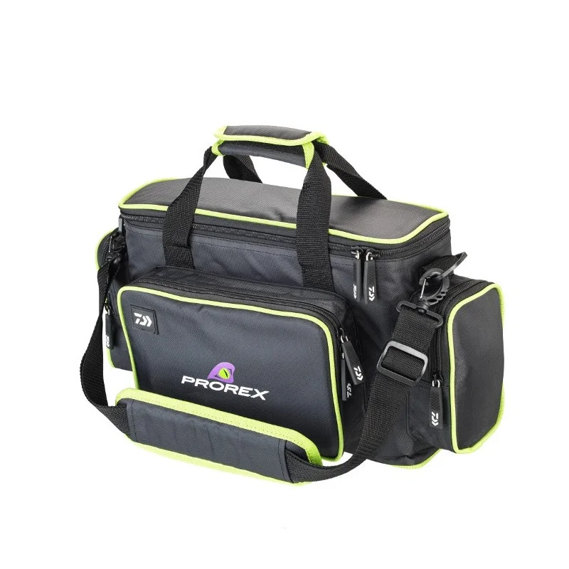 Niedroga torba na akcesoria z programu DAIWA Prorex, solidnie wykonana, pojemna i w bardzo dobrej relacji ceny do jakości. Gumowane dno chroni przed przedostawaniem się wilgoci od spodu. Antypoślizgowe podkładki zapobiegają ślizganiu się po wilgotnym podłożu -idealnie sprawdza się w łodzi. Duża główna komora zawiera 2 duże pudełka na przynęty, doskonałe do przechowywania imitacji z miękkiego plastiku, woblerów, główek jigowych itd. Duża przednia kieszeń i dwie boczne zapewniają sporą ilość miejsca na dokumenty i różne drobiazgi. Obszyty pas gwarantuje komfort podczas przenoszenia nawet mocno obciążonej torby.