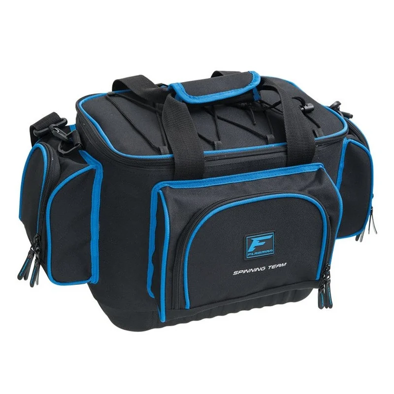 Wystarczająco duża i pojemna spinningowa torba zapinana na suwak, do transportu i przechowywania ubrań, sprzętu wędkarskiego i pudełek na przynęty. Torba wykonana z wytrzymałej tkaniny syntetycznej. Wodoodporne, twarde dno jest uformowane z gęstego gumowanego materiału. Torba wyposażona jest w dwie kieszenie boczne i jedną przednią.