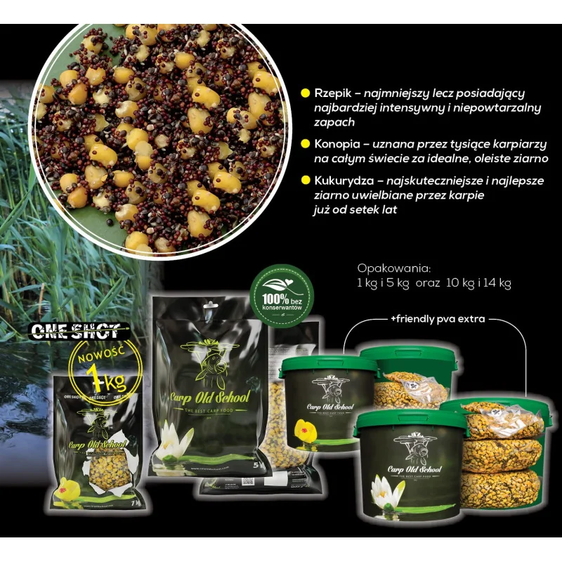 Żadne inne połączenie kilku rodzai ziaren nie jest tak skuteczną zanętą/przynętą jak połączenie kukurydzy, konopi i rzepiku.