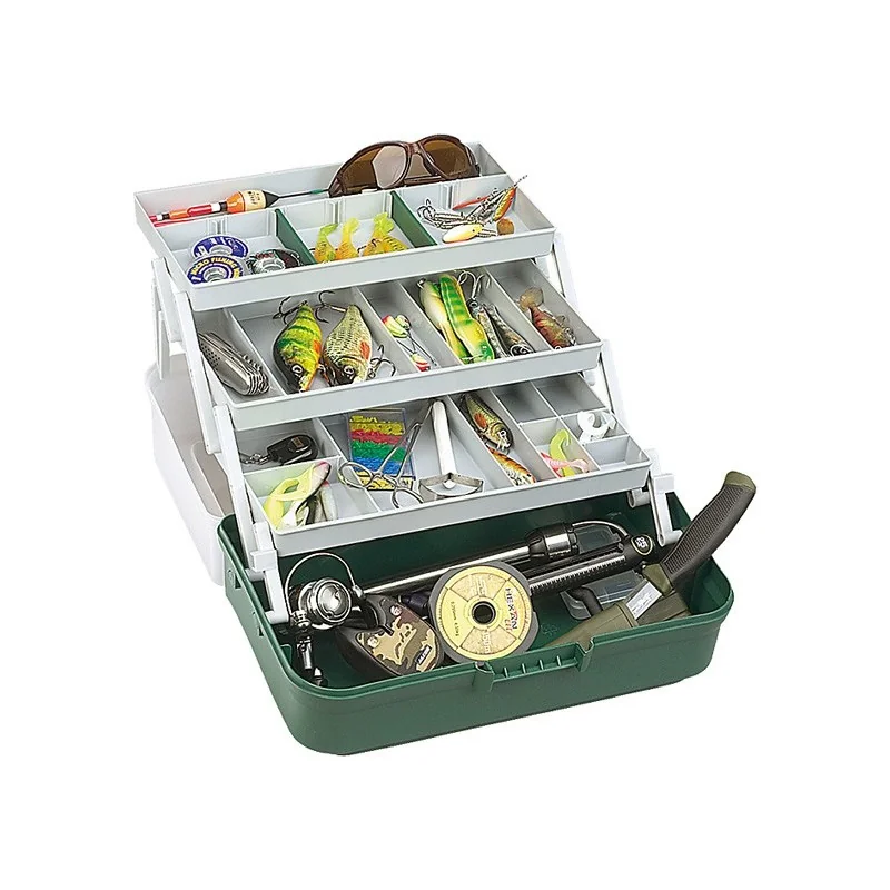 Średniej wielkości skrzynka wędkarska z trzema szufladami.