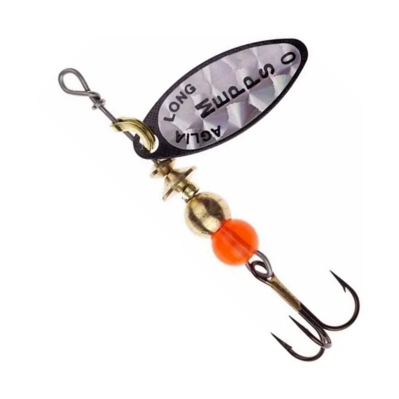 Hologram w tęczowosrebrzystym, łuskowatym ubarwieniu naklejony na paletkę Aglia Long – i oto powstała błystka udatnie naśladująca połyskującą rybkę. Podczas wirowania wypisz-wymaluj ukleja, kiełbik, strzebelka. Na wodach stojących, szczególnie w starszych zbiornikach zaporowych oraz kanałach żeglugowych, błystki tego typu są zabójcze na sandacze. Od większych modeli nie stronią także sumy i duże szczupaki, mniejsze atakowane są przez okonie. Na łowiskach specjalnych o charakterze stawowym Aglia Long Rainbo jest niezwykle skuteczna na pstrągi tęczowe. W rzekach nizinnych na małe wielkości można się spodziewać brań kleni, jazi, okoni. “Trójka” jest niezawodna na duże bolenie. W krainie pstrąga i lipienia, szczególnie podczas pochmurnej pogody oraz zmąceń, refleksy hologramu wyciągają z ostoi nawet niemrawe ryby.
