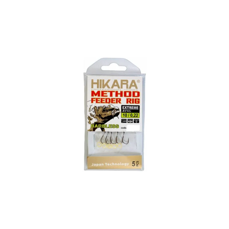 Haczyk bezzadziorowy z przyponem Extreme Ring to zestaw method feeder z kutym haczykiem Hikara Extreme o prostym profilu na mocnej żyłce.