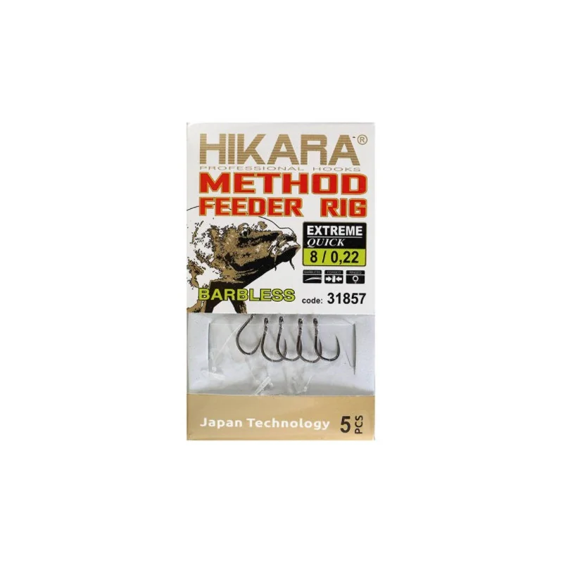 Haczyk bezzadziorowy z przyponem Extreme Quick to zestaw method feeder z kutym haczykiem Hikara Extreme o prostym profilu na mocnej żyłce. Japońska technologia i najwyższe parametry techniczne.