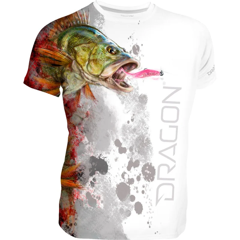 T-shirt Okoń - Biały to koszulka z krótkim rękawem typu raglan. Komfortowa odzież wędkarska z cienkiego poliestru. Materiał przepuszcza powietrze i jest szybkoschnący. Nadruk ryby okoń jest trwały i niezwykle realistyczny. Odważne wzornictwo dla pogromcy drapieżników.