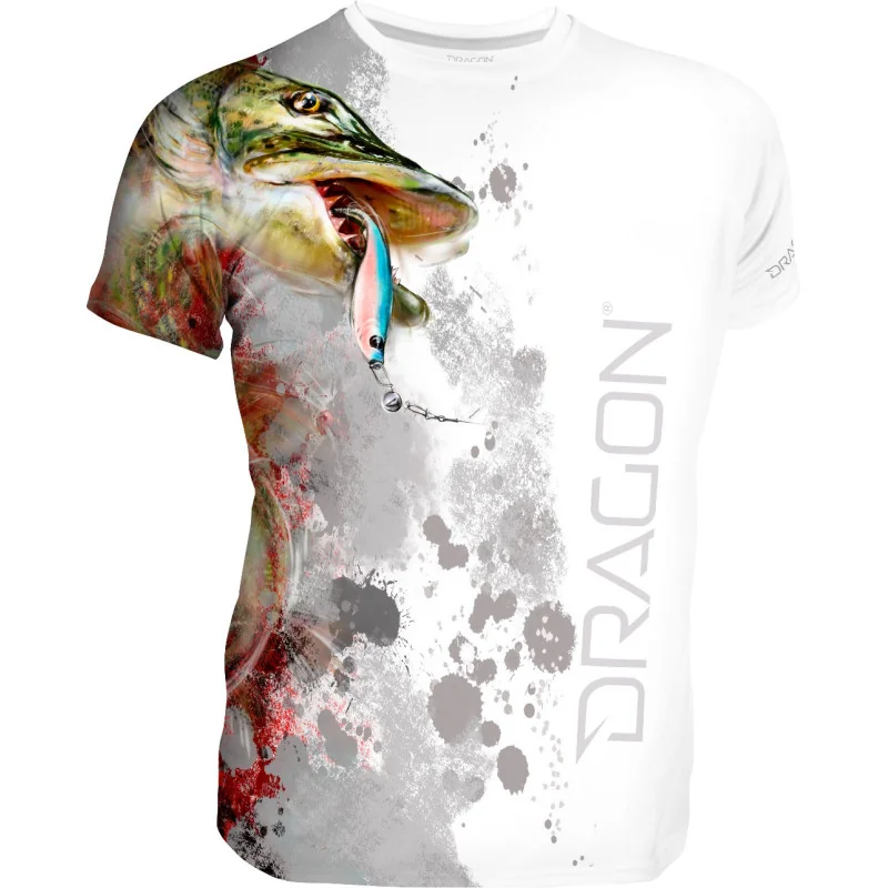 T-shirt Szczupak - Biały to koszulka z krótkim rękawem typu raglan. Komfortowa odzież wędkarska z cienkiego poliestru. Materiał przepuszcza powietrze i jest szybkoschnący. Nadruk ryby szczupak jest trwały i niezwykle realistyczny. Odważne wzornictwo dla pogromcy drapieżników.